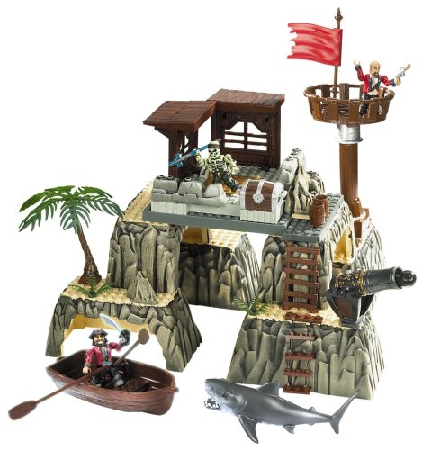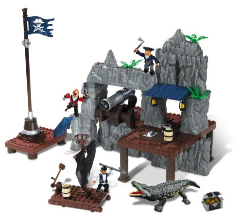 Smuggler's Fort is largely comprised of 6 arched rock pieces. These pieces stack together to create a rather convincing mountain facade. At the top of the mountain sits a small fort. The fort features two windows, a trap door for dropping loot or figures, and a large crow's nest that sticks out from the side.