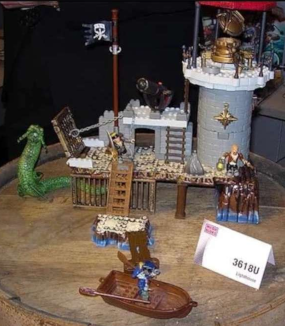A prototype of the Privateers' Lighthouse was shown off at New York Toyfair 2005. As you can see, the main structure of the set is pretty much identical to how it would release. Just with some recolored parts and placeholder figures. We can also see an interesting green serpent here, rather than the red one. Fun fact, this serpent actually did end up releasing. It came out as part of a Dragons' set! So it is technically possible to get it for collections!