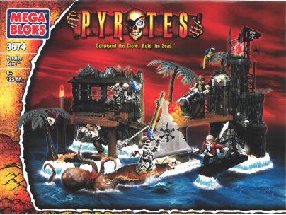 Pyrates Cove is a playset that was released in wave 1 of the original Pyrates toyline. The set is quite large and has a lot to play with! Its honestly one of my favorites. The set comes with six figures (three Sea Marauders, two skeletons, and one Privateer), a monkey, an octopus, a longboat, and some other accessories. It contains 125 pieces total and is set #3674. The set also released in a fancy collectors tin, rather than a cardboard box.
