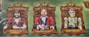 The last figure is the Buccaneer named Gaptooth Gorvinsky. He wears a tan shirt with leather holsters on them. He also wears brown pants. His head is a very common mold. Its shared with many Pyrates such as Dawson Doubloon, Pascal Scallywag, Blackboots Burton, Burt Bounty, etc. Gorvinsky wears a black bandana and wields a crossbow.